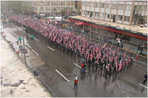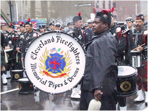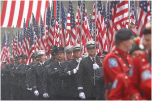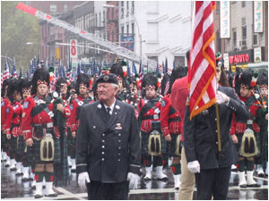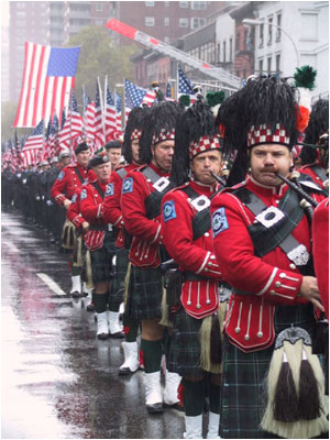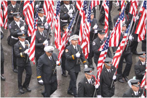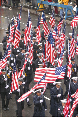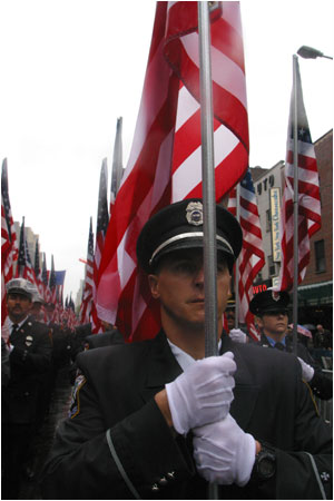 The ceremony began with an estimated 55,000 firefighters marching up Eighth Avenue from 14th to 33rd Streets in a mile-long procession behind the funereal skirls of bagpipes and rolling drums. The procession included a color guard carrying 356 American flags, representing the number of firefighters killed in the line of duty since the last service was held in October, 2000.